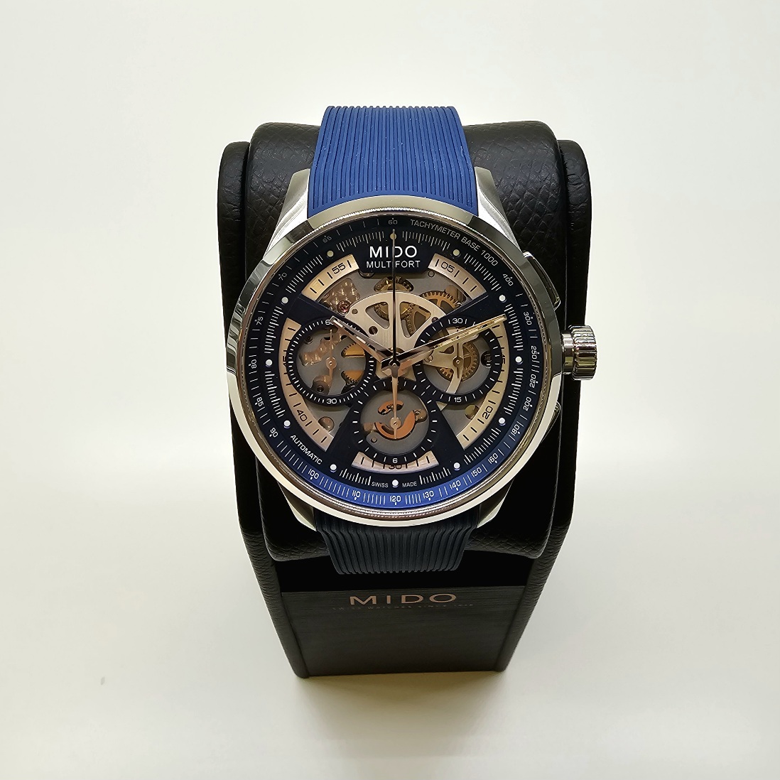 Der Multifort Skeleton Chronograph vereint Einzigartigkeit, Spitzentechnologie und außergewöhnlicher Handwerkskunst. Dieses anspruchsvolle und präzise Schweizer Automatikwerk ist das Herz dieser Sportuhr mit fortschrittlicher Chronographenfunktion. Das Skelettzifferblatt mit seinen sorgfältig gefertigten Zeigern offenbart die mechanische Komplexität der Uhr und gewährleistet gleichzeitig optimale Lesbarkeit durch Saphirglas, das auf beiden Seiten mit einer Antireflexbeschichtung versehen ist. Der transparente Gehäuseboden zeigt die Schönheit des automatischen Skelett-Chronographen Kaliber 60 A05.951, der erstmals von MIDO entwickelt und lanciert wurde.